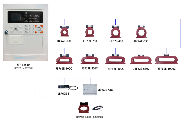 JBF-62S30電氣火災系統由JBF-62S30型電氣火災監(jiān)控設備,JBF62E系列組合式電氣火災監(jiān)控探測器、JBF62E-AT8組合式電氣火災監(jiān)控探測器(分體式)、JBF62E-T1測溫式電氣火災監(jiān)控探測器組成,通過監(jiān)控設備和現場部件組成的電氣火災監(jiān)控系統對被保護線路的漏電流值和溫度值進行實時監(jiān)控。